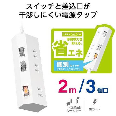 エレコム(ELECOM) T-IS01-2320WH ホワイト 電源タップ 延長コード 2m コンセント 3個口 ほこりシャッター 極性対応 絶縁キャップ 個別スイッチ