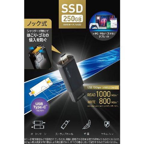 エレコム(ELECOM) ESD-ESK0250GBK ブラック SSD 外付け 250GB USB3.2 Gen2 読込最大1000MB/秒 ポータブルSSD USB Type-C ノック式 高速 耐衝撃