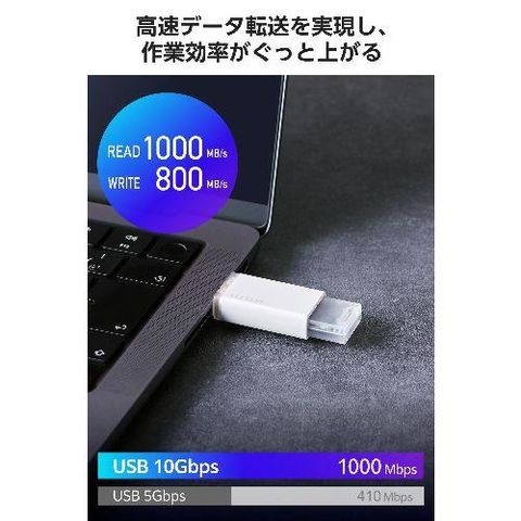 データ転送速度:読み込み:最大1000MB/s、書き込み:最大800MB/s ※当社環境での測定値 ※USB 10Gbps(USB3.2(Gen2))でご使用になるには、機器側がUSB 10Gbps(USB3.2(Gen2))に対応している必要があります。