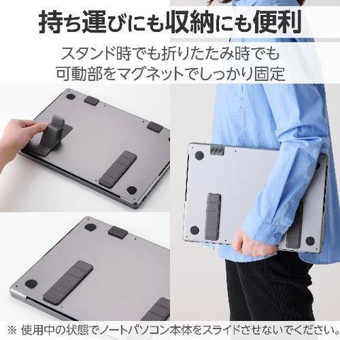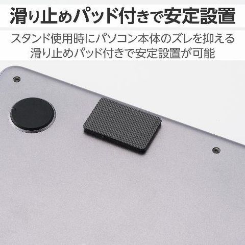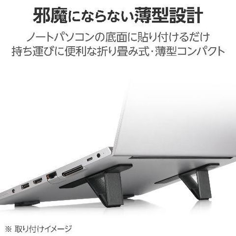 ■ノートパソコンの底面に貼り付けて使用可能。貼り直しもできます。※何回か貼り直すと粘着力が弱くなります。ご了承ください。※耐荷重を超える機器本体は設置できません。機器本体の重量をご確認ください。