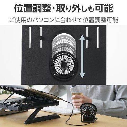 ■スタンドの中央付近に、ノートパソコンの過熱を防ぐ冷却ファンを搭載。冷やしたい場所に合わせて、上下に位置を調節可能です。