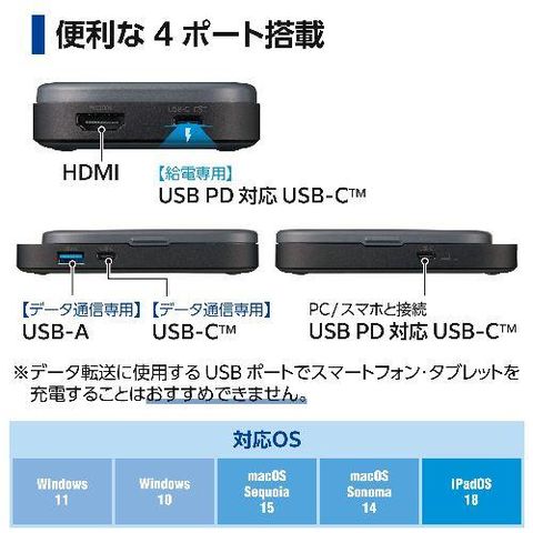 コネクター仕様(アップストリーム):USB Type-C(TM)ポート[USB 10Gbps(USB3.2(Gen2))]、USB Power Delivery対応(最大入力100W / 最大出力85W)、DisplayPort(TM)Alt mode(USB2.0接続時はUSB2.0互換で動作(USB2.0時は映像出力非対応))