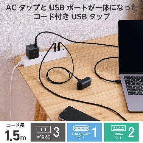 ■ACタップとUSBポートが一体になった、スマートフォンやワイヤレスイヤホンなどを充電できるコード付きUSBタップです。ACアダプターなどを別途用意することなく、本製品1つで充電できます。