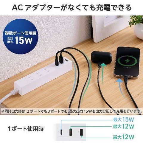 USB側定格出力(1ポート使用時):USB Type-Cポート:15W(5V/3A)、USB-Aポート:12W(5V/2.4A)