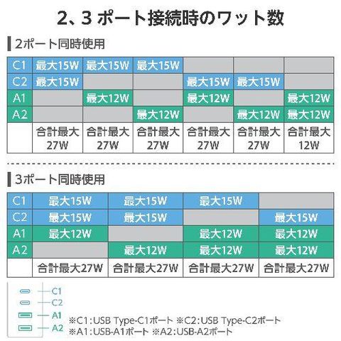 USB側定格出力(2ポート使用時):USB Type-Cポート+USB Type-Cポート:合計27W(5V/5.4A)(各USB Type-C 15W(5V/3A))、USB Type-Cポート+USB-Aポート:合計27W(5V/5.4A)(USB Type-C 15W(5V/3A)、USB-A 12W(5V/2.4A))、USB-Aポート+USB-Aポート:合計12W(5V/2.4A)(各USB-A 12W(5V/2.4A))