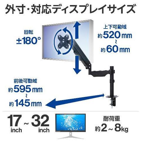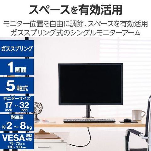 ■17~32インチサイズのモニターに対応する、ガススプリング式のシングルモニターアーム、支柱付きです。