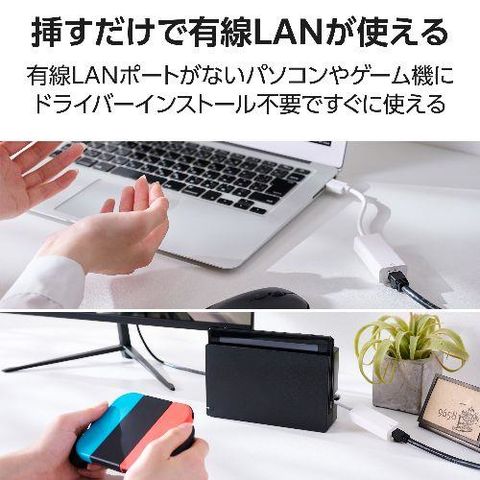 ■有線LANポートがない薄型パソコンやNintendo Switch(TM)などのゲーム機に便利な、挿すだけですぐに使えるUSB-A 1Gbps有線LANアダプターです。