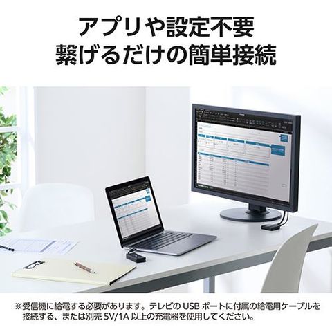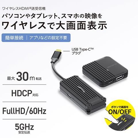 ■USB Type-C(TM)搭載のパソコンやスマートフォン、タブレットなどの映像・音声を、1台のテレビ、ディスプレイやプロジェクターなどのHDMI(R)搭載映像機器に、ワイヤレスで出力できる送信機と受信機のセットです。※HDR、CEC、ARC、HECは非対応です。