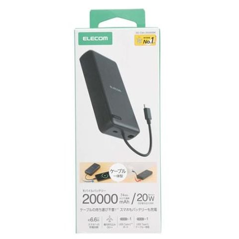 エレコム(ELECOM) DE-C64-20000-BK ブラック モバイルバッテリー 大容量 20000mAh USB-C ケーブル一体型 スマホ等充電可