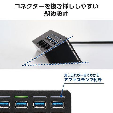 ■電源ON/OFFに切り替えられる個別スイッチタイプで、デスク回りのUSB機器を使いたいときだけ電源ONにして節電できます。個別アクセスランプを搭載していて、電源ON/OFFがひと目で分かり電源の消し忘れを防ぎます。