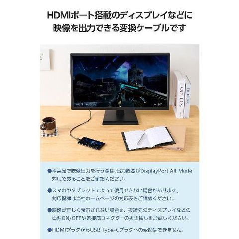 ■HDMI(R)ポート搭載のディスプレイなどに映像を出力できる変換ケーブルです。USB Type-C(TM)ポート搭載スマートフォンなどの映像信号を、HDMIポート搭載ディスプレイなどに映像を出力することができ、画面複製と画面拡張に対応しています。※HDMIプラグからUSB Type-Cプラグへの変換はできません。※音声出力に対応しています。