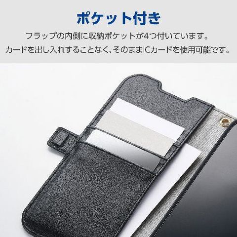 ■4つのカードポケットを備えた、ハンドストラップ付きの手帳型ケースです。