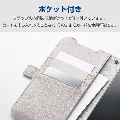 ■4つのカードポケットを備えた、ハンドストラップ付きの手帳型ケースです。