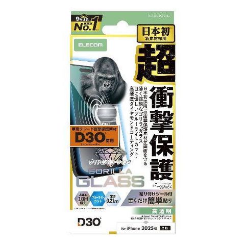 エレコム(ELECOM) PM-A25AFLG3ODBL iPhone17 ガラスフィルム 高透明 ブルーライトカット D3O R 超衝撃保護 10H超 Gorilla R 傷に強い 薄型