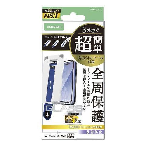 エレコム(ELECOM) PM-A25CFLGFTM ブラック iPhone17 Pro ガラスフィルム アンチグレア 全周保護 角割れ防止 フレーム付 9H 簡単貼り付けツール付
