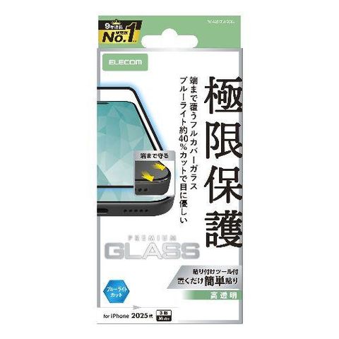 エレコム(ELECOM) PM-A25CFLKGGBL iPhone17 Pro ガラスフィルム 高透明 ブルーライトカット 全面ガラス 画面率99% 10H 指紋防止 気泡防止