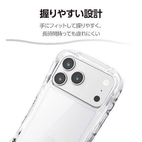 ■全周に配置した独自設計のエアークッションが衝撃を吸収し、背面には高硬度のポリカーボネート素材を採用。中央のくびれ形状に平坦な面を設けることで、手に馴染む快適なグリップ感を実現したGrippyシリーズのハイブリッドケースです。端末のデザインが美しく際立つオールクリアタイプです。