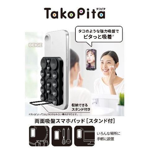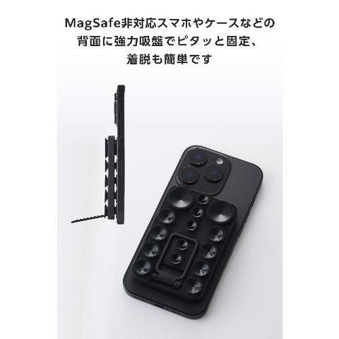 ■壁や鏡、窓ガラスなどの平らな面にシリコン吸盤で簡単に吸着可能。スマートフォンを自由な向きで固定できます。※素材によっては吸着できない場所があります。※取り付け面は、必ず平らで清潔な状態にしてください。※落下するおそれがあるため、長時間の連続した使用は避けてください。