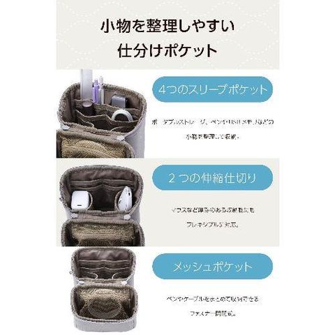 ■ポータブルストレージ、ぺンやUSBメモリなどの小物を整理して収納できる4つのスリーブポケットを備えています。