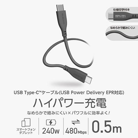 エレコム(ELECOM) MPA-CCPESS05GY グレー 240W PD EPR USB Type-C ケーブル 0.5m やわらかシリコン eMarker 480Mbps
