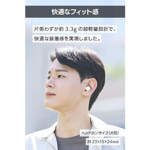 外形寸法:ヘッドホン(片耳):幅約23mm×奥行約15mm×高さ約24mm、充電ケース:幅約58mm×奥行約29mm×高さ約34mm