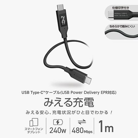 エレコム(ELECOM) MPA-CCW10BK ブラック 240W PD EPR USB Type-C ケーブル 1m 電力ディスプレイ付き やわらかシリコン eMarker 480Mbps