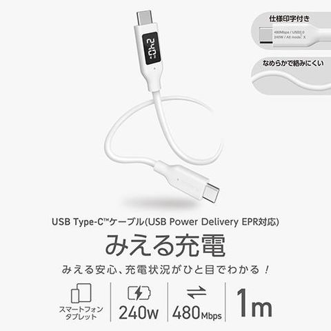 エレコム(ELECOM) MPA-CCW10WH ホワイト 240W PD EPR USB Type-C ケーブル 1m 電力ディスプレイ付き やわらかシリコン eMarker 480Mbps