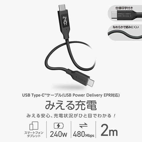 エレコム(ELECOM) MPA-CCW20BK ブラック 240W PD EPR USB Type-C ケーブル 2m 電力ディスプレイ付き やわらかシリコン eMarker 480Mbps
