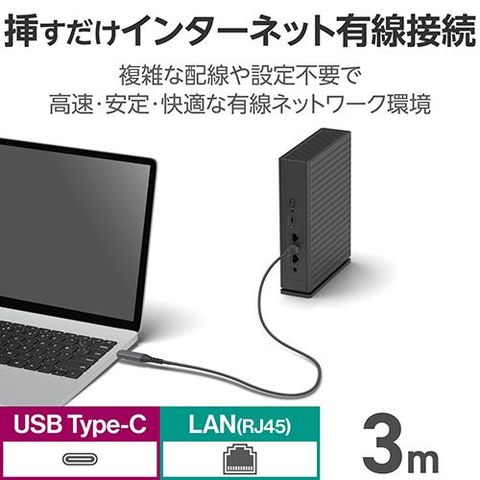 ■有線LANポートがないUSB Type-C(TM)ポート搭載のノートパソコンや、Nintendo Switch(TM)などのゲーム機に接続するだけで、安定した通信ができるUSB Type-C有線LAN変換ケーブルです。このケーブル1本でより快適なインターネット環境が手に入ります。