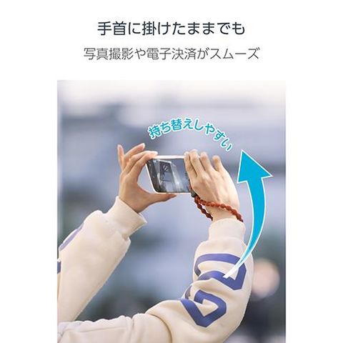 ■ひもは柔らかく伸縮し、手首に掛けたままでも写真撮影や電子決済をスムーズに行えます。