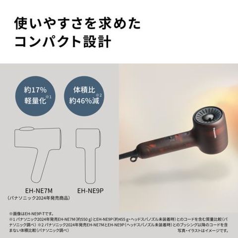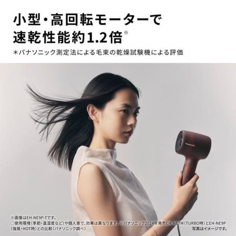 ●小型・高回転モーターで高圧・高速の風を作り出し、圧巻の速乾性を実現。速乾性能約1.2倍(★当社測定法による毛束の乾燥試験機による評価★)(※当社2024年発売EH-NE7M(TURBO時)とEH-NE9P(強風・HOT時)との比較(当社調べ)※)。