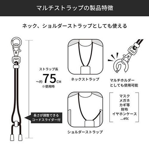 ■ショルダーストラップは最長約75cm(使用時)、長さが調節できるコードスライダー付き