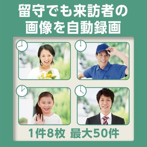 来訪者を動画でSDカードに保存できます。またSDカードに録画した来客動画をパソコンで保存・再生可能です。SDカード(別売品)を使うと1件 約30秒の動画を最大3,000件録画可能 *SDカードの容量によって最大録画件数は異なります。モニター親機の本体メモリーに、約1秒おきの連続画像(最大8枚録画50件まで)も可能です。