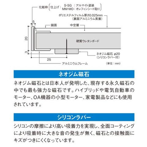 表面:ポリエステルフィルム・構造枠:アルミニウム・芯材:硬質ウレタン・マグネット:ネオジム磁石