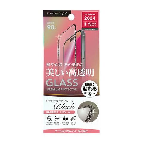 PGA PG-24AGLL01BK ブラック/高透明 iPhone16用 液晶全面保護ガラス ラメフレーム