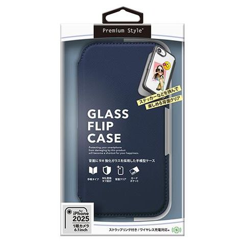PGA PG-25KGF06NV ネイビー iPhone 16e用 ガラスフリップケース サフィアーノ調 手帳型ケース