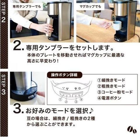 ■タンブラー付属で、マグカップにも対応 付属のサーモタンブラーはもちろん、メッシュプレートの高さを変えることでお手持ちのマグカップにも対応可能