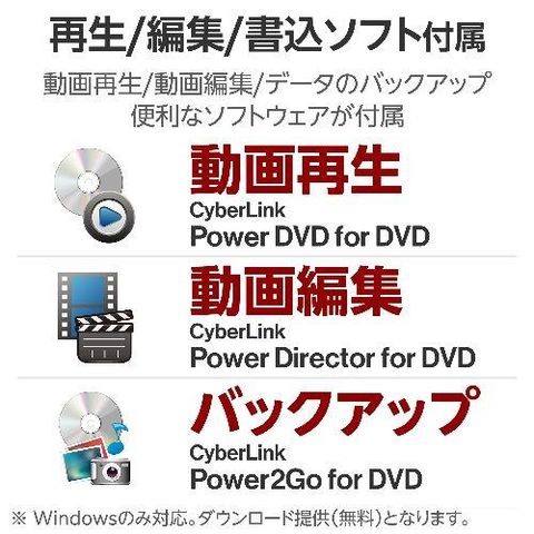 付属ソフト1:CyberLinkMediaSuite(動画再生ソフト:PowerDVDforDVD、動画編集ソフト:PowerDirectorforDVD、データ書き込みソフト:Power2GoforDVD)※無償ダウンロード提供。