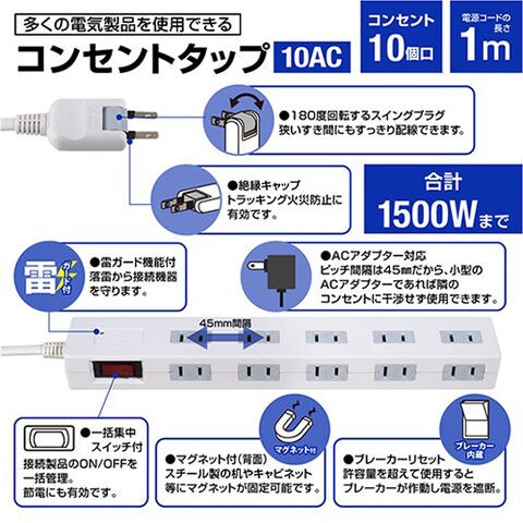 STYLED(スタイルド) STP10W-1 ホワイト ACタップ 10個口 10個口 上挿し5・横挿し5 1m