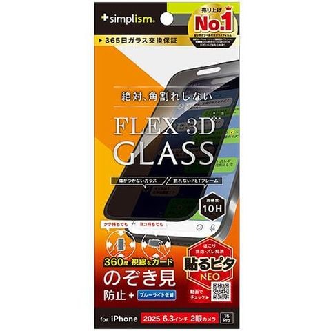 トリニティ iPhone17 / iPhone 16 Pro用 FLEX 3D 360° のぞき見防止 複合フレームガラス ブラック TR-IP25M2-G3-LFPVCBK