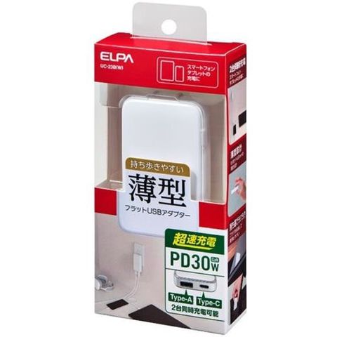 エルパ(ELPA) UC-23B-W ホワイト USB急速充電器 フラットUSBアダプター PD 30W USB Aポート×1 Cポート×1