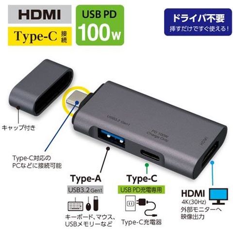 インターフェース ダウンストリーム側(接続機器側):USB Aメスx1、Type-Cメスx1(PD充電専用)、HDMI(タイプA 19ピン)メスx1