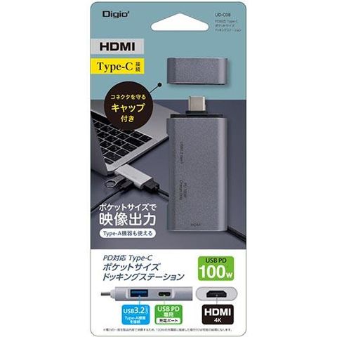 ナカバヤシ UD-C08GY グレー PD対応 Type-C ポケットサイズドッキングステーション