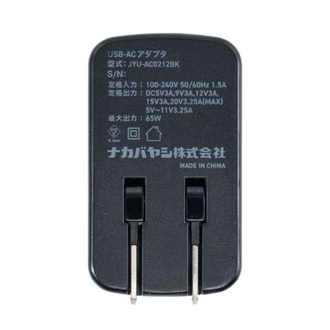 ナカバヤシ JYU-AC0212BK ブラック GaN 65W PD充電器ケーブル一体型 1.2m