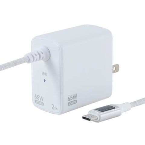 ナカバヤシ JYU-AC0220W ホワイト GaN 65W PD充電器ケーブル一体型 2m