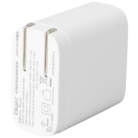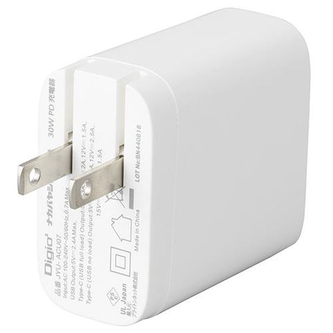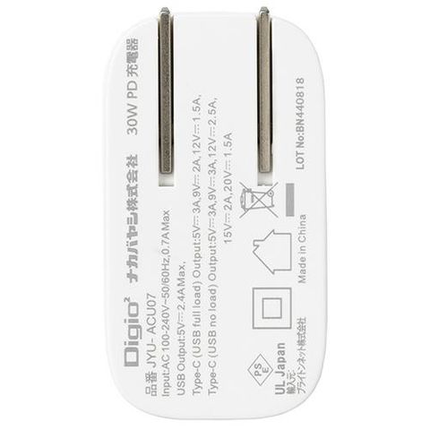 ナカバヤシ JYU-ACU07-W ホワイト 30W PD充電対応 Type-C 1ポート+USB-A 1ポート充電器
