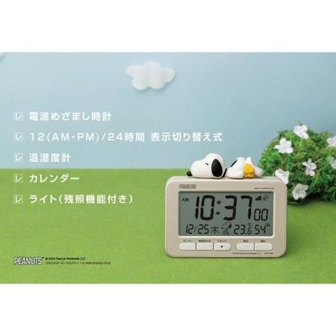 ●スヌーピーとウッドストックのフィギュアが付いた電波デジタルめざまし時計です。
