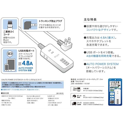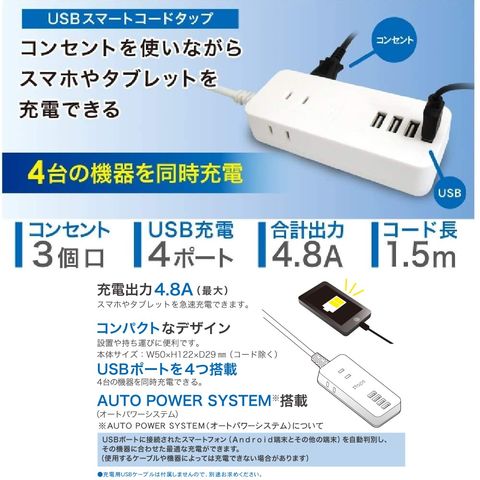 トップランド TPU15-WT USB電源タップ AC3個口 USB4ポート 1.5m 急速充電 オートパワーシステム搭載
