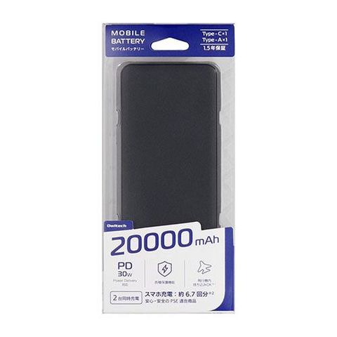 オウルテック(OWLTECH) OWL-LPB20016-BK ブラック 20000mAh 最大PD30W対応 USB Type-C入出力/USB Type-A出力 モバイルバッテリー
