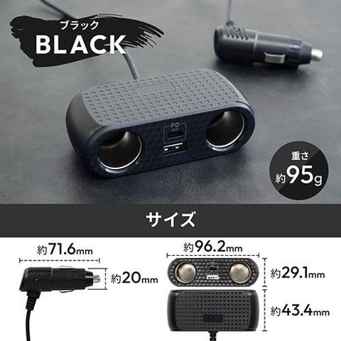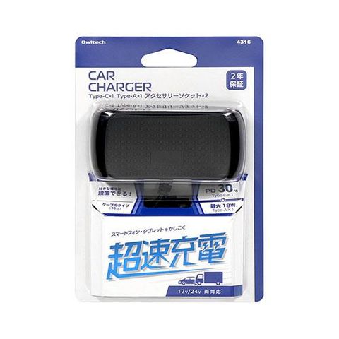 オウルテック(OWLTECH) OWL-CCUCD2C2-BK ブラック 2ポート /USB Power Delivery対応ケーブル型車載充電器 2穴+Type-A+Type-C/PD30w 分配器
